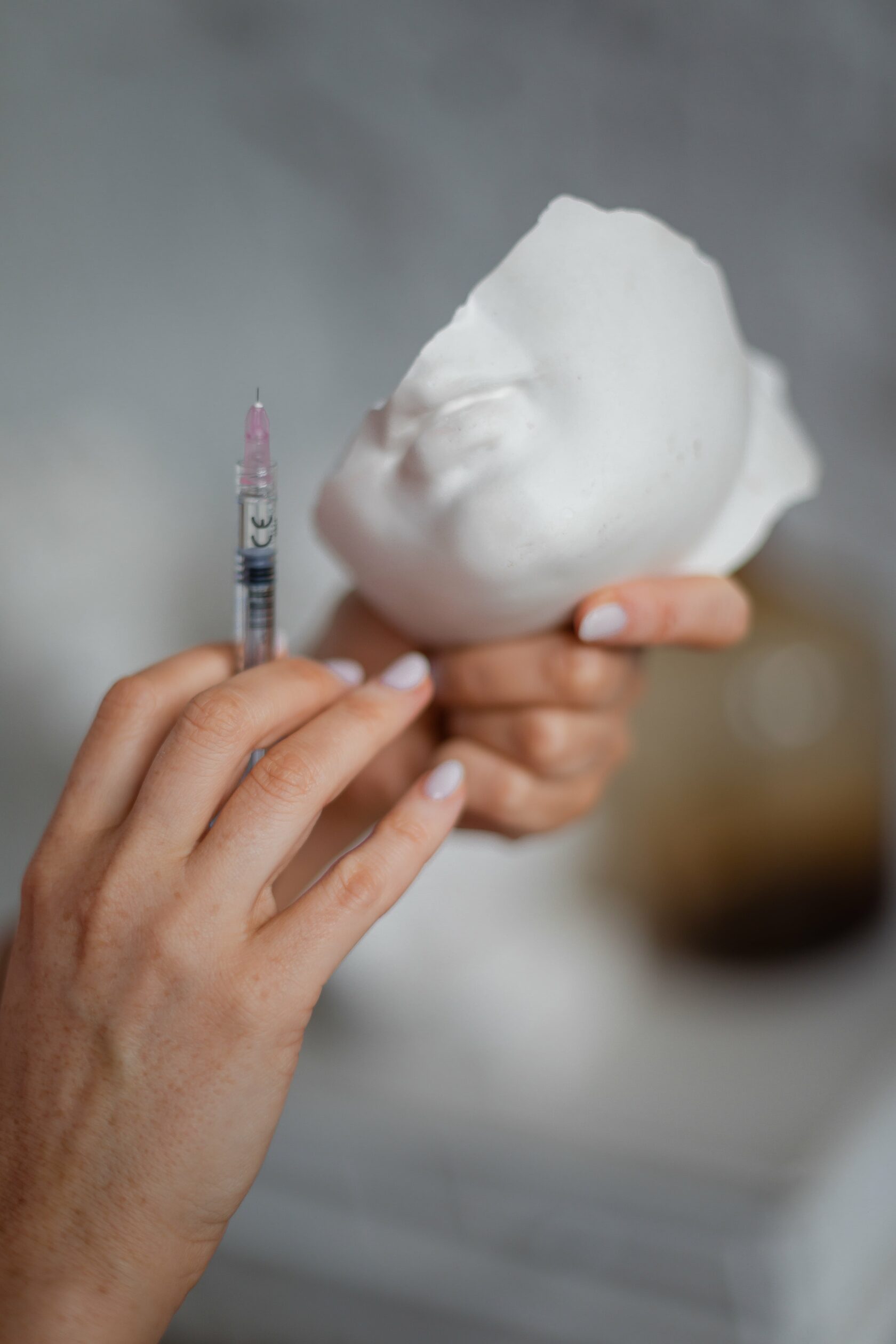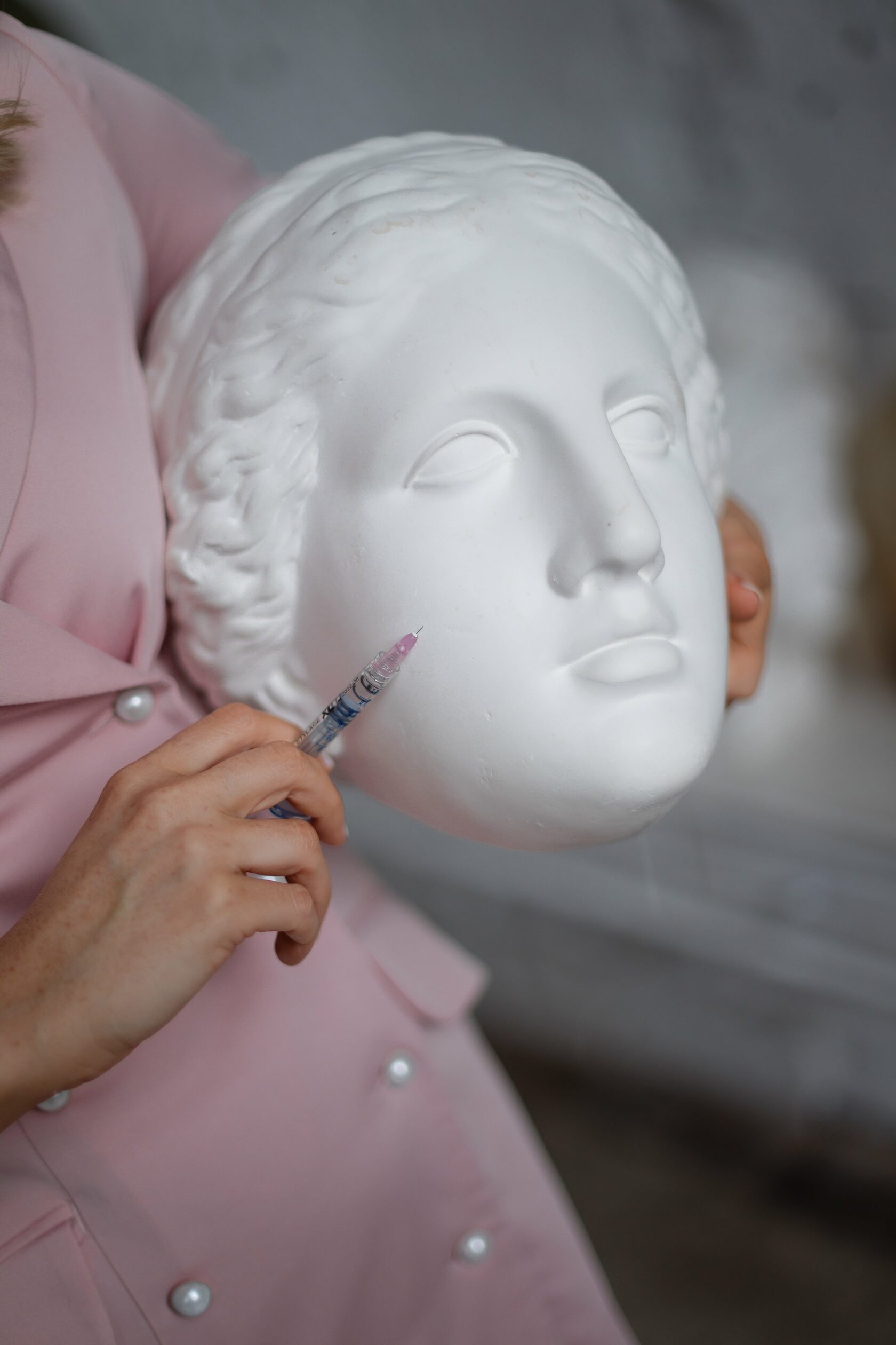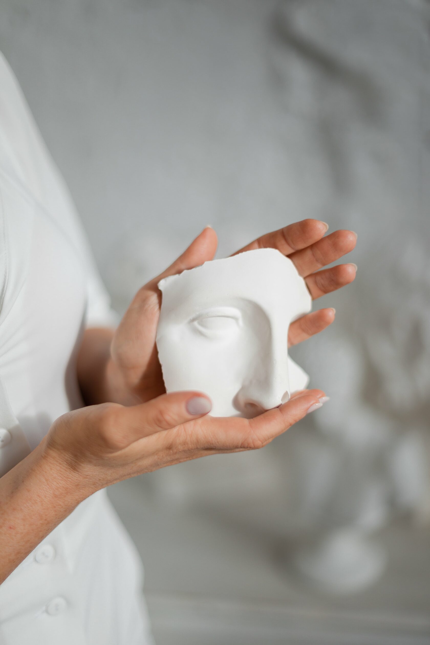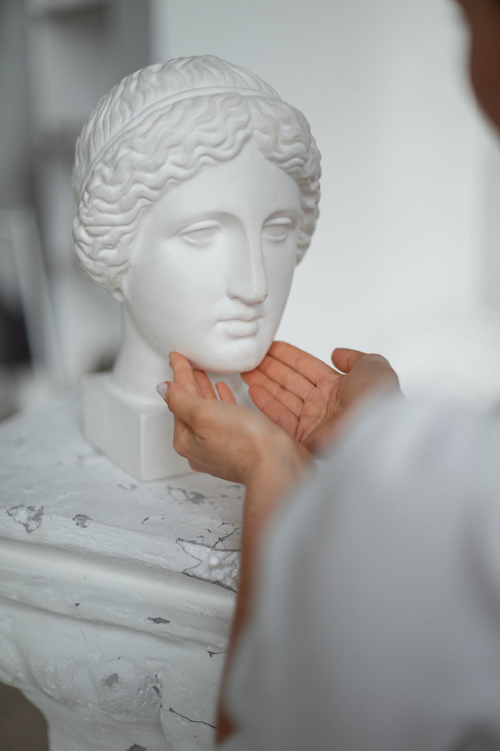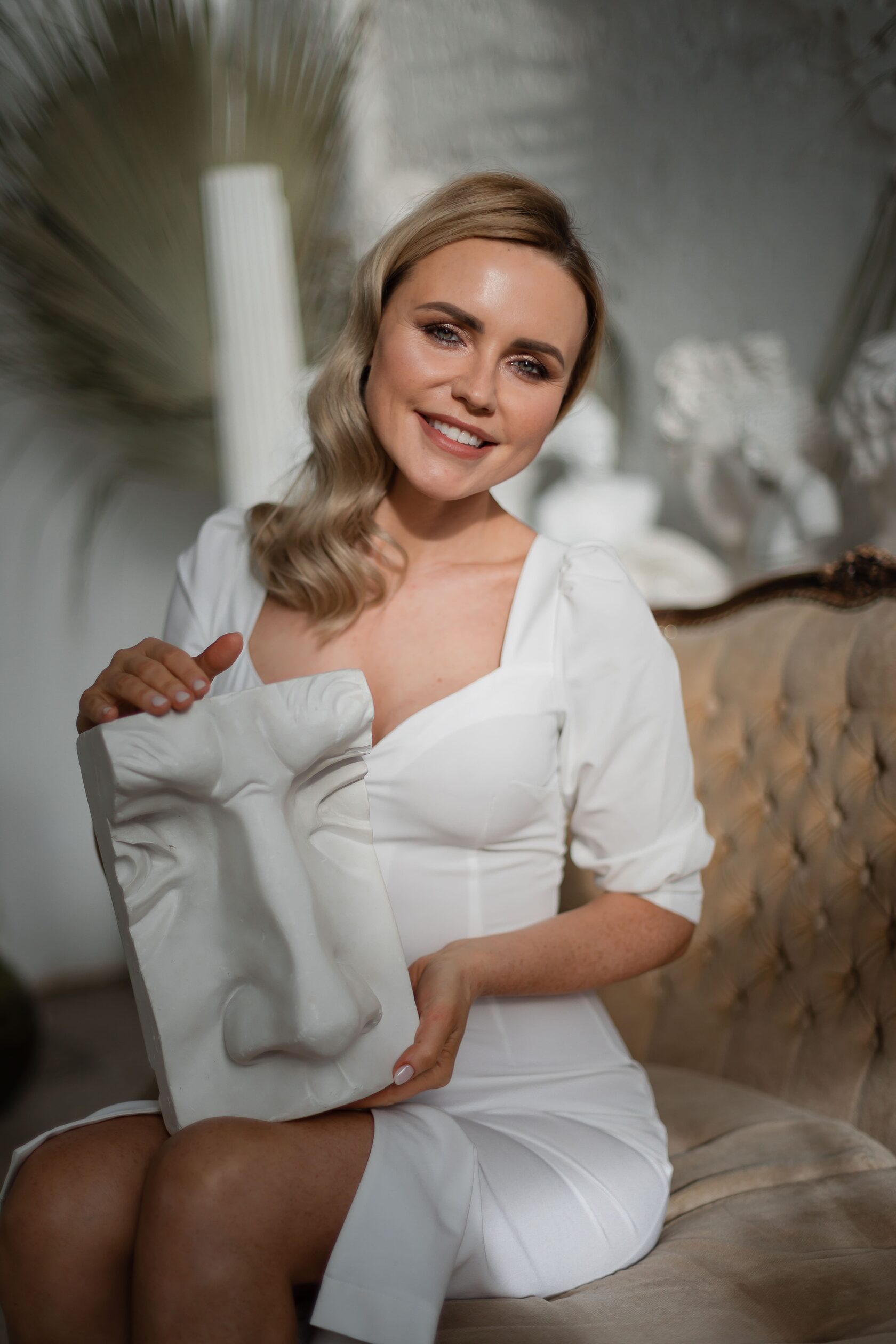 Так как одежда могла быть только рабочая, я подсказала идею реализовать кадры с гипсовыми фигурами и лицами, чтобы съемка вышла не слишком строгой