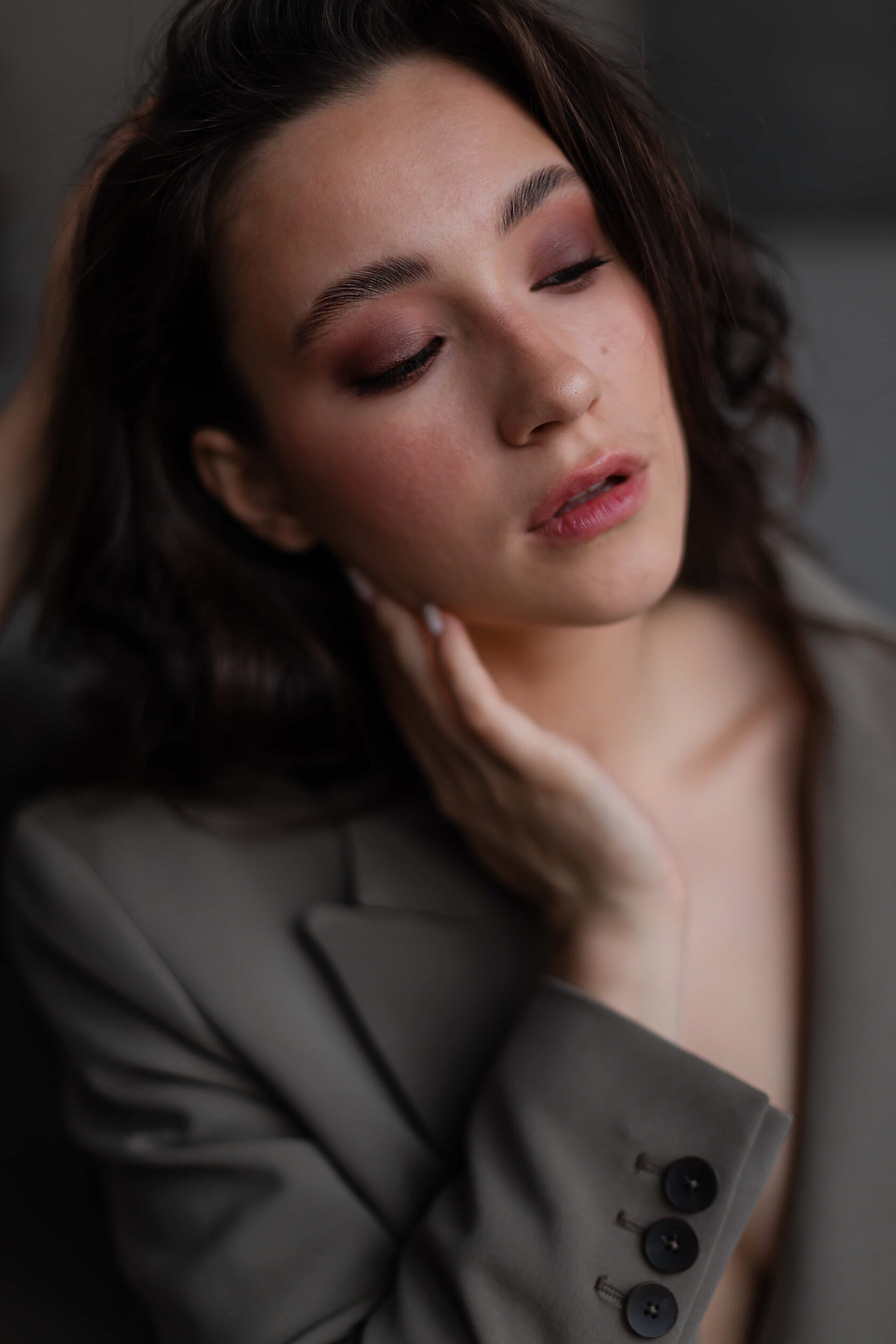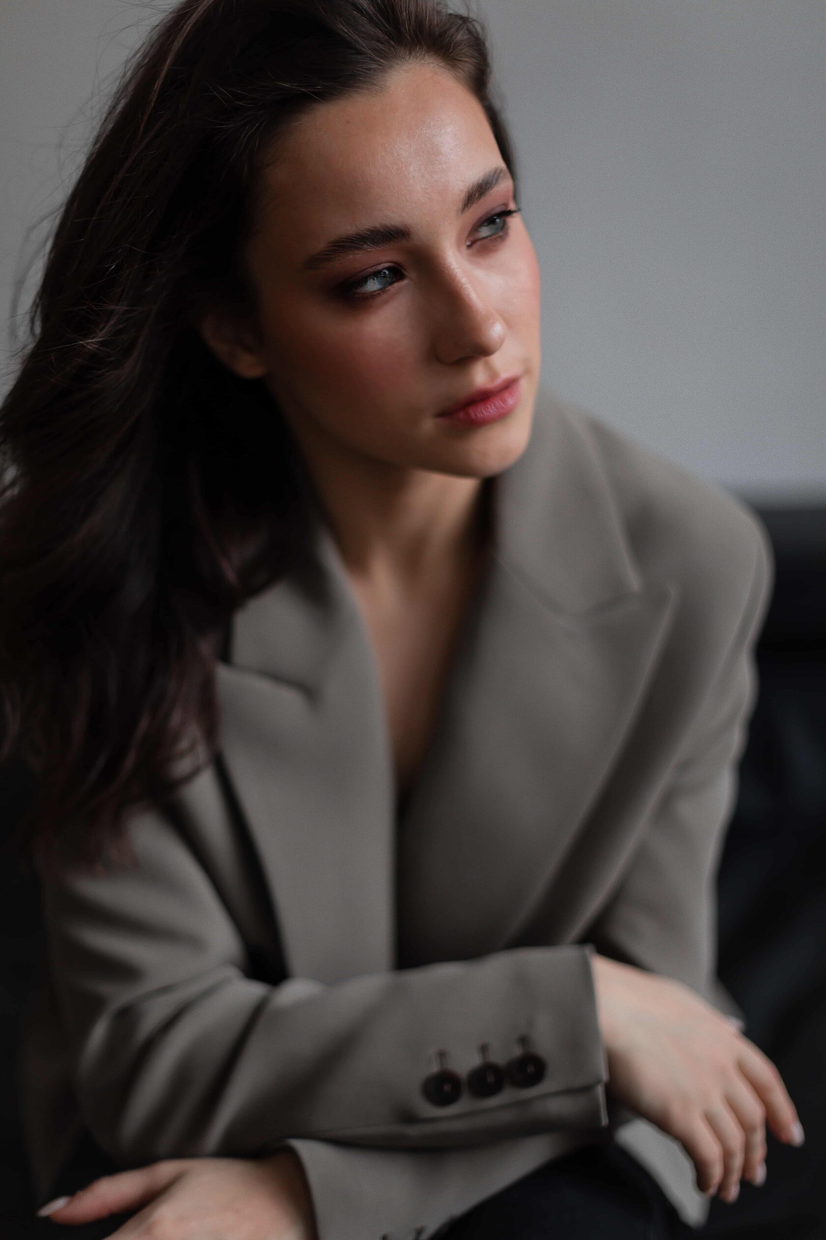 Был выбран сдержанный стиль, распущенные волосы и легкий макияж, который отражает естественную красоту Алины