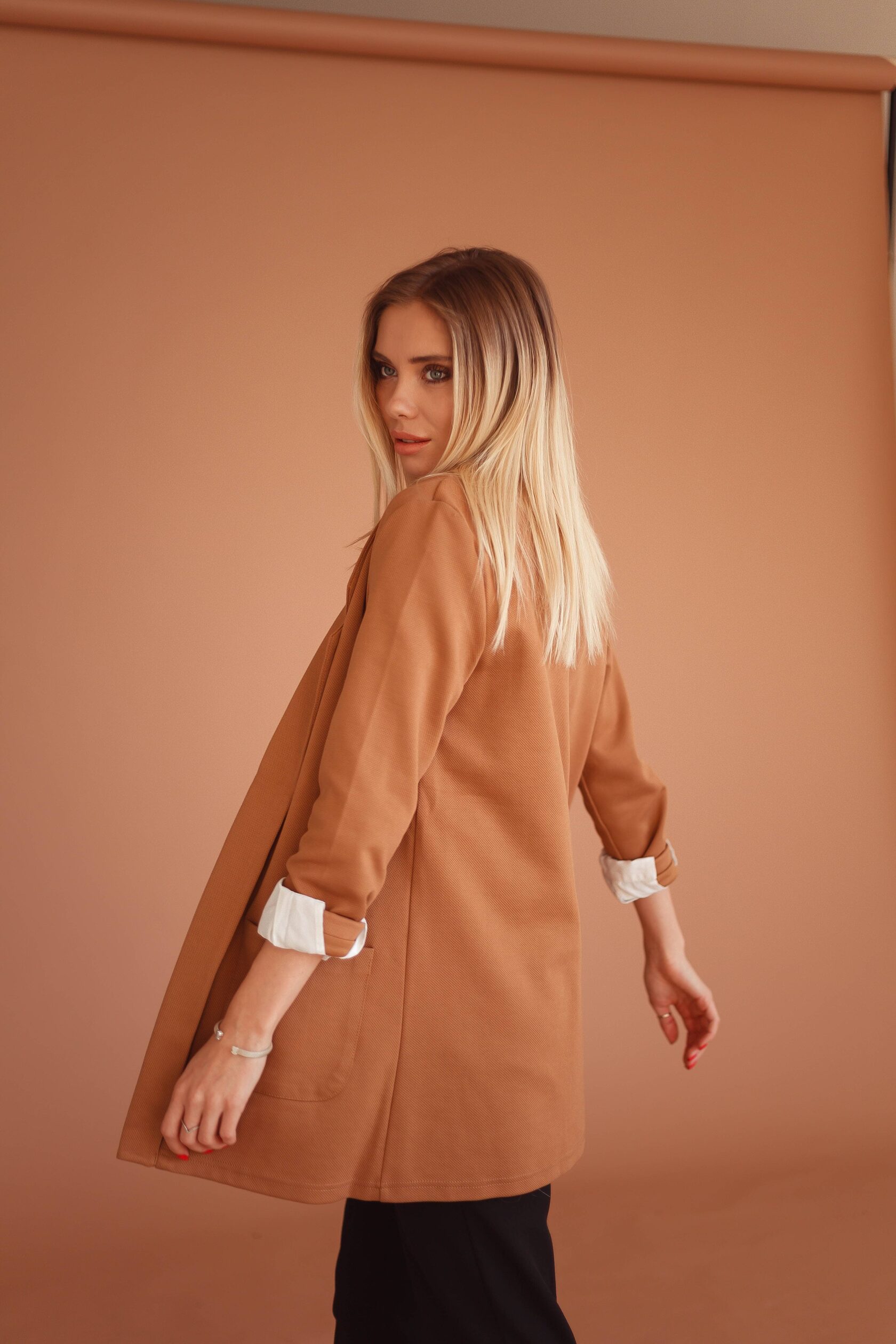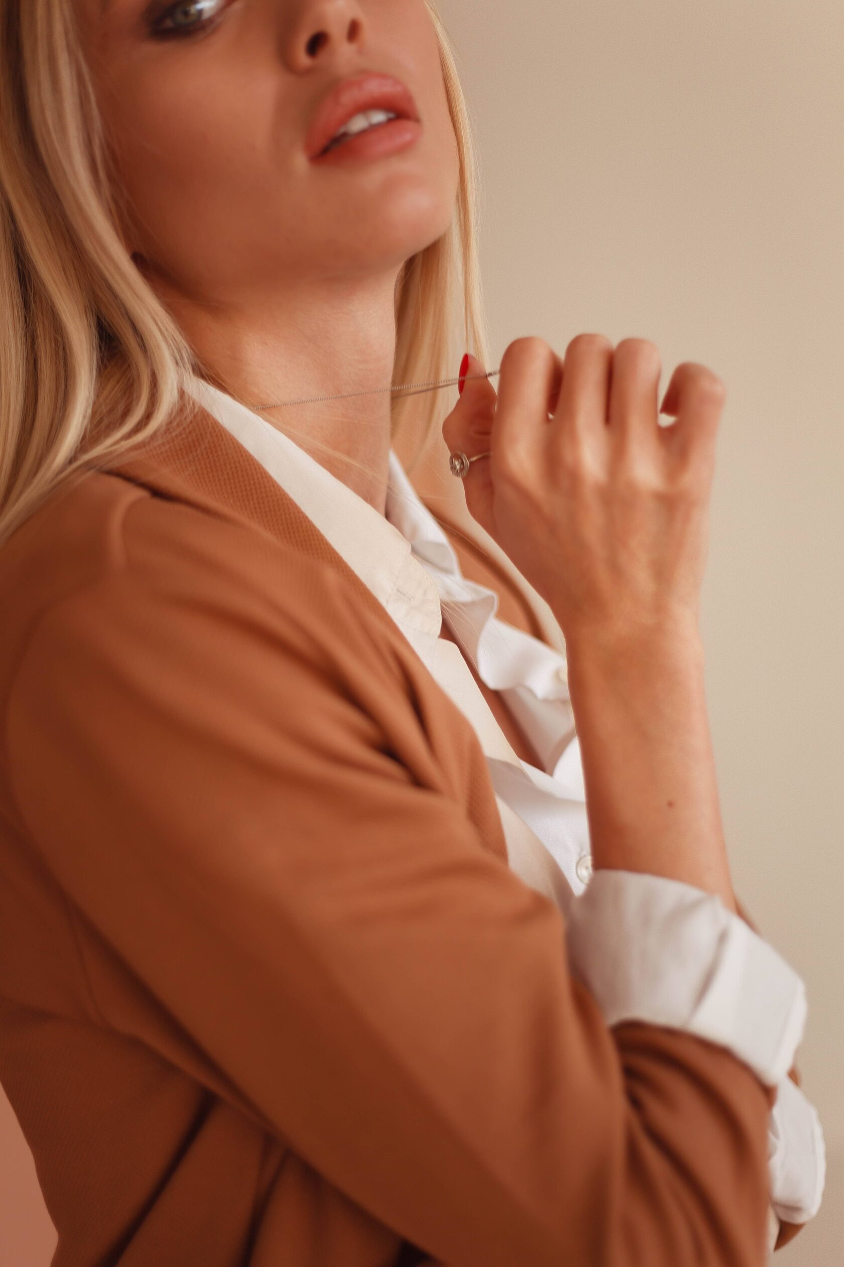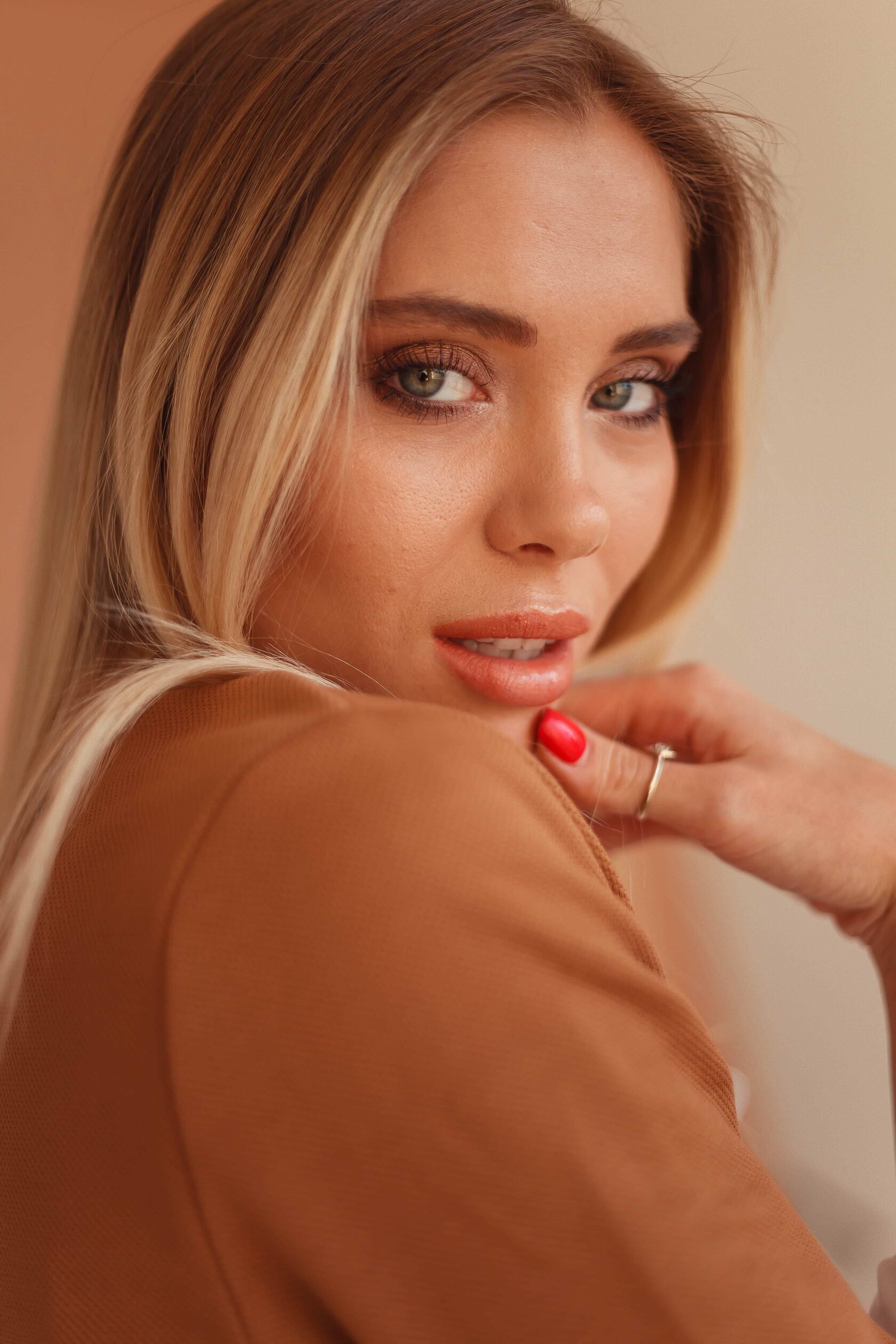 Поэтому я предложила ей студию с обыкновенным бежевым фоном и подобрала соответствующий наряд под стилистику